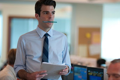 As Dale tells the executioners that he needs to finish this equation, they politely tell him, "This is not your problem anymore." "This," is the equation that will rivet the American economy into the Great Recession, but "this" is a case of mistaken identity: when the lay-off crew was going around and tapping people on the shoulder so they would know they were next in line, it's Peter Sullivan (Zachary Quinto) who is tapped as being "Eric Dale." Peter points to where Eric is, but this is no accident: it's symbolic of the equation and the "mistake" that Eric Dale had pointed out a year earlier and everyone mistook for something else entirely. After he's "released," the company has turned his phone off; after Peter breaks the news of what has happened, they spend nearly the whole rest of the night trying to get a hold of him. Towards the end, he shows up to just sit in the room, quietly, while the brokers work the fire sale, and they end up paying him $176,000/hour to just sit there, when yesterday, they booted him without even a cell phone and on half-salary.
